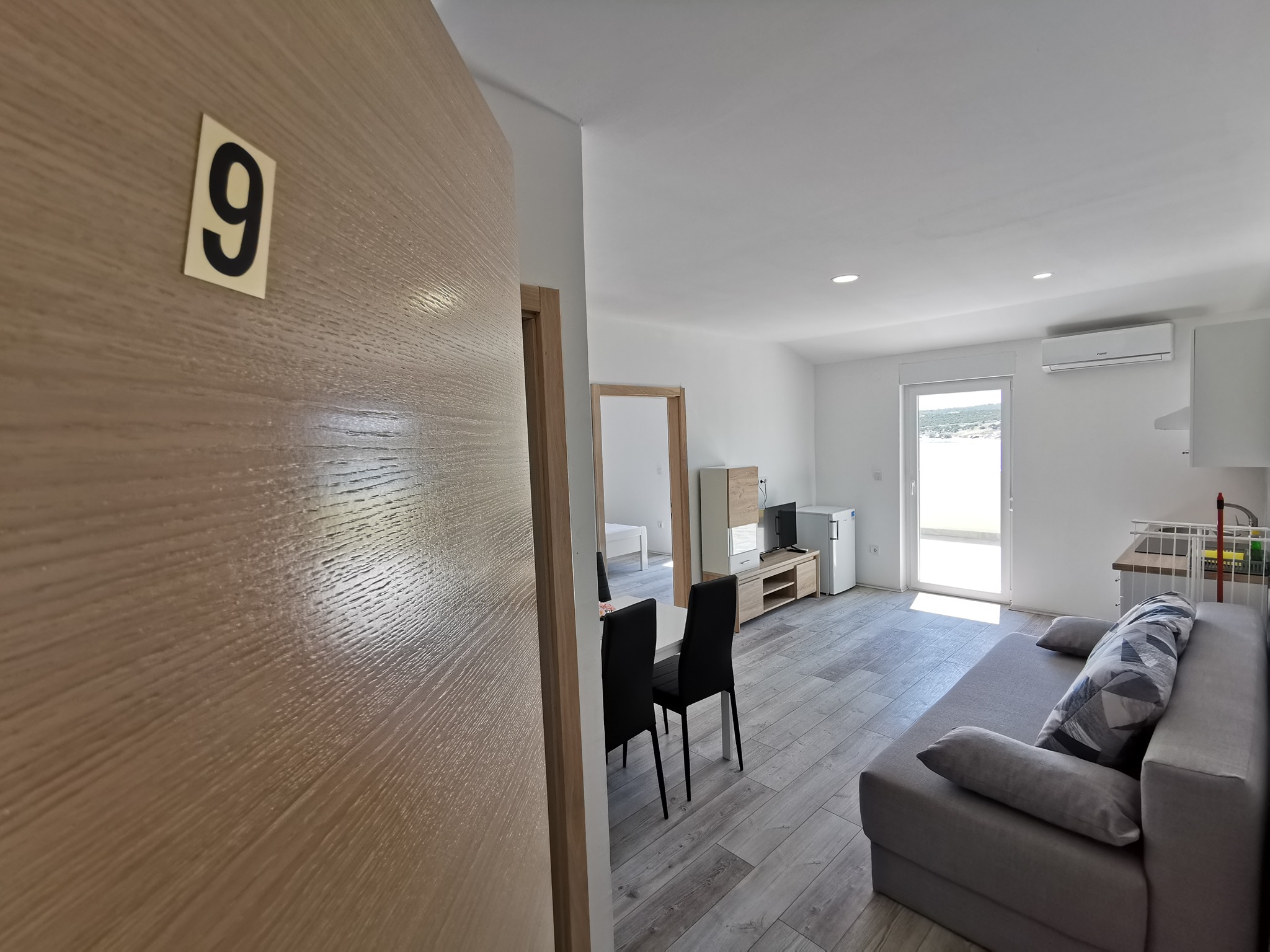 Die Wohnung 9 befindet sich im 2.OG des Hauses und bietet von dem Balkon aus exzellenten Meerblick. Die Wohnung ist hochwertig ausgestattet mit zwei Schlafbetten und einem Schlafsofa. Sie besteht aus einem Wohn/Essbereich mit offener Küche, Bad mit Dusche, 1 Schlafzimmer.